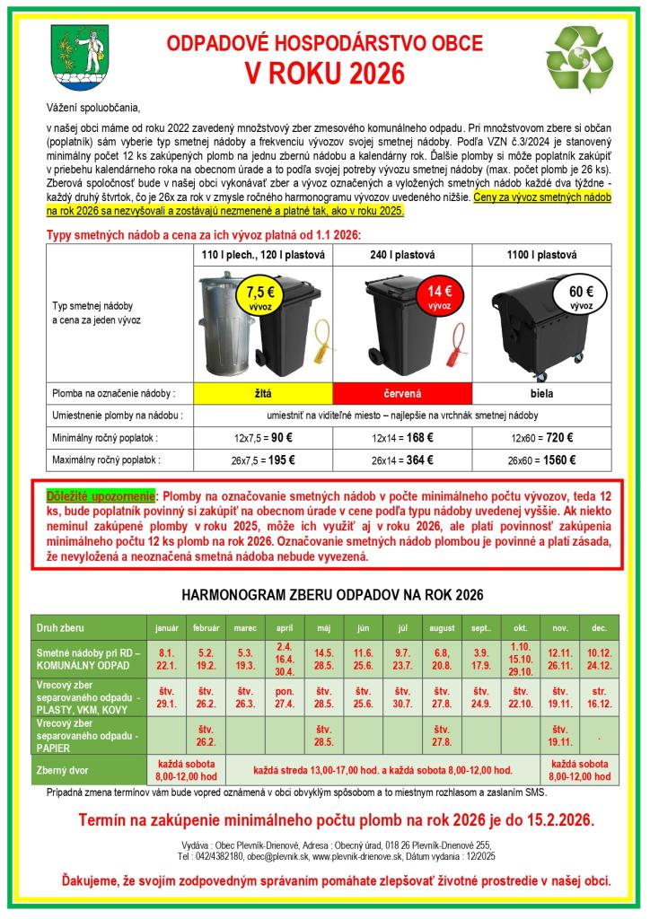 Vážení spoluobčania, v našej obci máme od roku 2022 zavedený množstvový zber zmesového komunálneho odpadu. Pri množstvovom zbere si občan (poplatník) sám vyberie typ smetnej nádoby a frekvenciu vývozov svojej smetnej nádoby. Podľa VZN č.3/2024 je stanovený minimálny počet 12 ks zakúpených plomb na jednu zbernú nádobu a kalendárny rok. Ďalšie plomby si môže poplatník zakúpiť v priebehu kalendárneho roka na obecnom úrade a to podľa svojej potreby vývozu smetnej nádoby (max. počet plomb je 26 ks). Zberová spoločnosť bude v našej obci vykonávať zber a vývoz označených a vyložených smetných nádob každé dva týždne - každý druhý štvrtok, čo je 26x za rok v zmysle ročného harmonogramu vývozov uvedeného nižšie. Ceny za vývoz smetných nádob na rok 2026 sa nezvyšovali a zostávajú nezmenené a platné tak, ako v roku 2025.